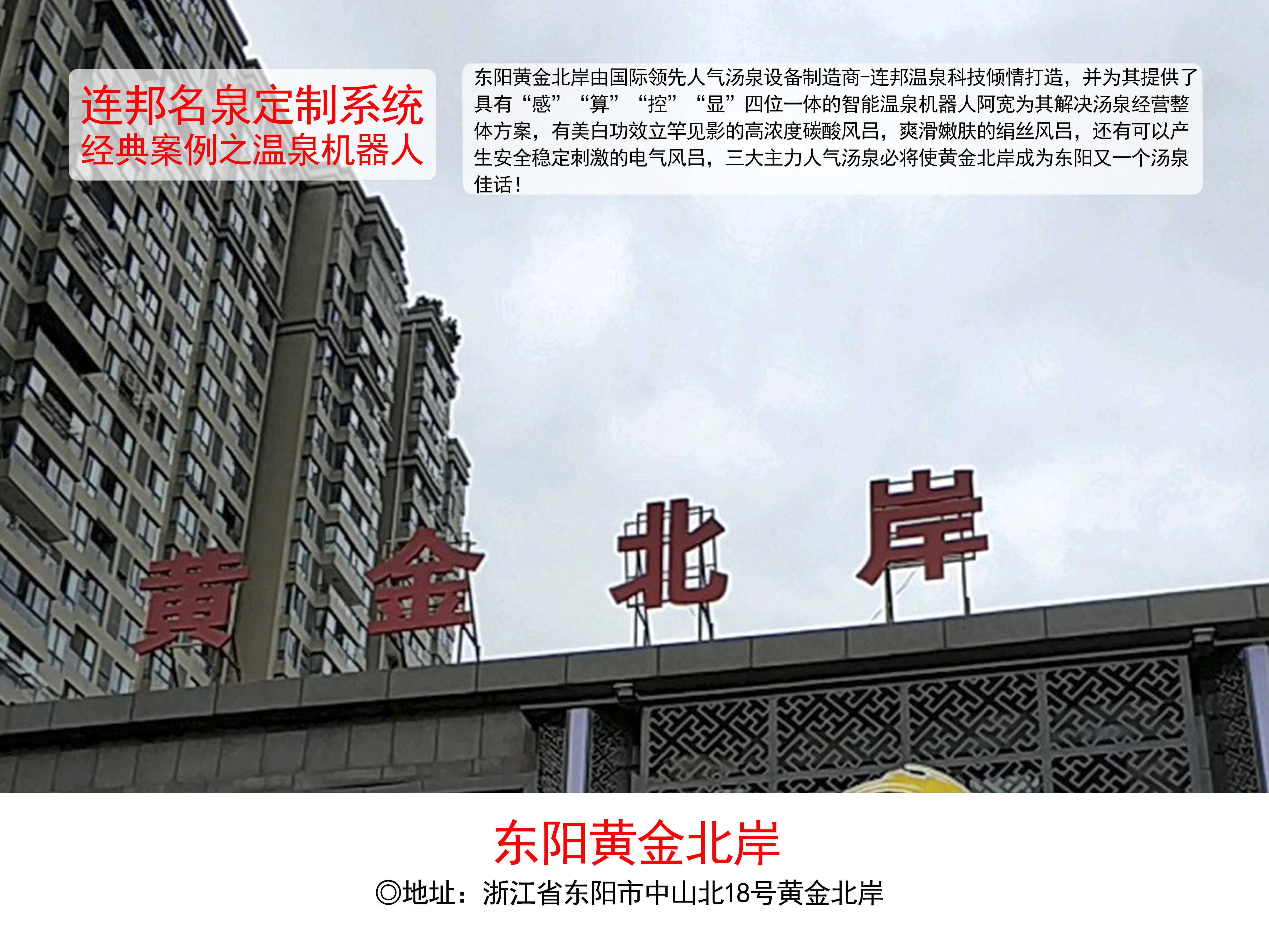 東陽黃金北岸由國際領先人氣湯泉設備制造商-連邦溫泉科技傾情打造,為其提供了具有“感”“算”“控”“顯”四位一體的智能溫泉機器人阿寬為其解決湯泉經營整體方案,有美白功效立竿見影的高濃度碳酸風呂,爽滑嫩膚的絹絲風呂,還有可以產生安全穩定刺激的電氣風呂,三大主力人氣湯泉必將使黃金北岸成為東陽又一個湯泉佳話!
